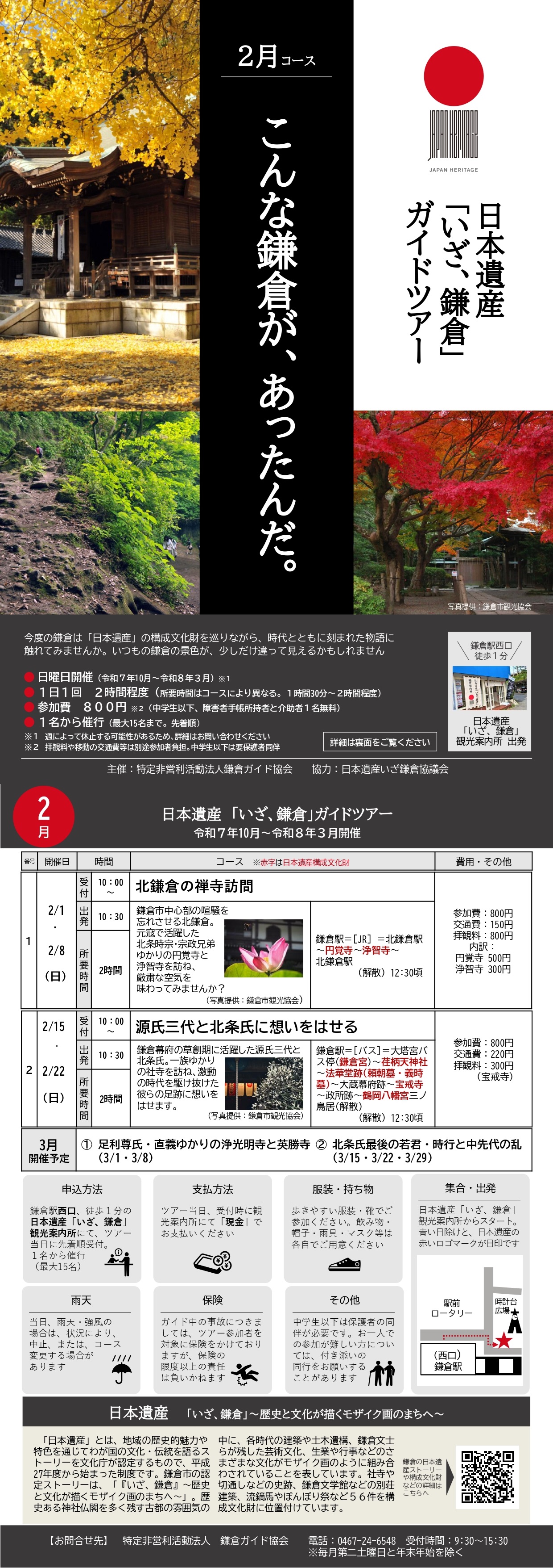 個人やグループの方のご希望のコース・ご希望時間でのガイド、私たち鎌倉ガイド協会が毎月企画する「古都鎌倉史跡めぐり」、修学旅行や校外学習のガイド、旅行会社の公募ツアーでのガイドなどを行っています。鎌倉と鎌倉周辺をより一層楽しんでいただくために、是非私どもをご利用下さい。 お問い合わせ:9:30~15:30 お問い合わせ電話:0467-24-6548 休日:第二土曜日、年末年始2025年12月27日(土)~2026年1月4日(日) Guided tours in Kamakura with Kamakura Guide Association (KGA)